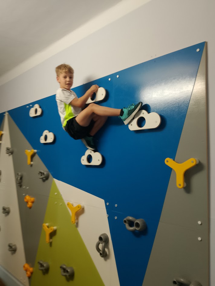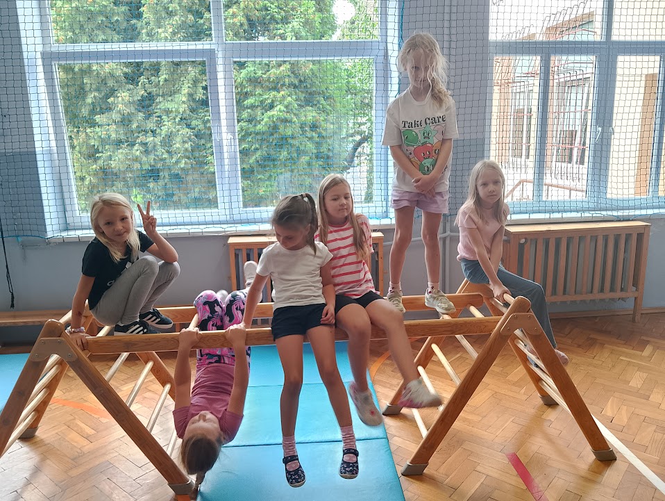 Na sali gimnastycznej odbywały się gry i zabawy ruchowe, wspinanie po ściance oraz zwinnościowy tor przeszkód.